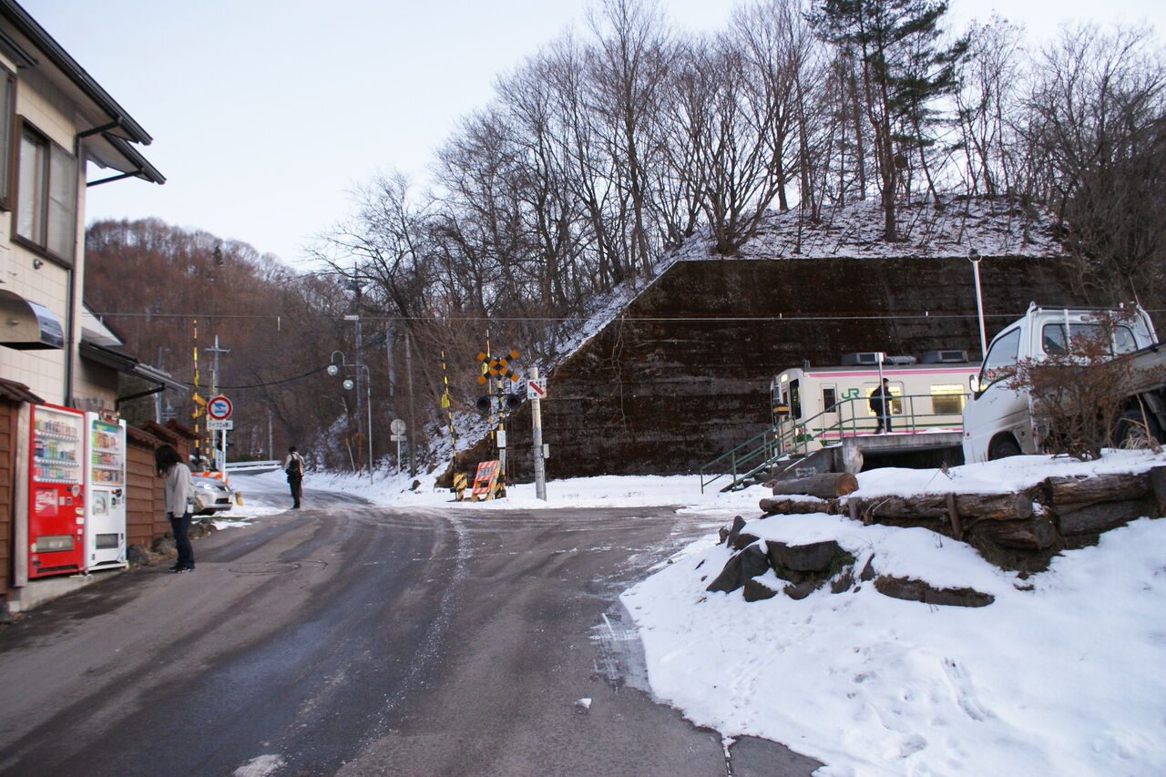 2022年02月18日 [JR吾妻線]大前踏切(55k411m) 〔踏切名称〕:大前踏切〔所在区間〕:JR吾妻線 万座・鹿沢口・大前間〔地点距離程〕:渋川起点 55k411m〔管理事業者〕:東日本旅客鉄道〔踏切所在地〕:群馬県吾妻郡嬬恋村大前1077番地〔踏切種別〕:第1種踏切(自動車通行可) JR吾妻線の終着駅である大前駅に隣接している第1種踏切です。 どれだけ近いか、、、踏切のすぐ横が駅です。 踏切名称は「大前踏切」といいます。踏切が所在している場所の地名(吾妻郡嬬恋村大字大前)が由来とみられます。 当踏切から大前方、下り方向を見た図です。すぐに大前駅に至ります。〔アクセス〕JR大前駅隣接〔訪問調査日〕2010年1月3日 「JR東日本」カテゴリの最新記事 「吾妻線」カテゴリの最新記事 タグ :#吾妻線#第1種踏切#群馬県 コメント コメントフォーム 名前 コメント 評価する リセット リセット 顔 星 投稿する 情報を記憶