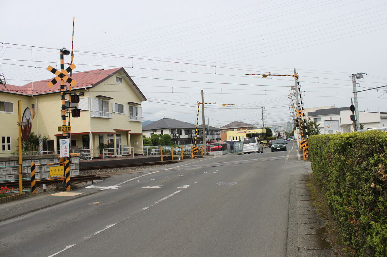 駅前ながら閑静な住宅街の幹線道路が交差する第1種踏切です。