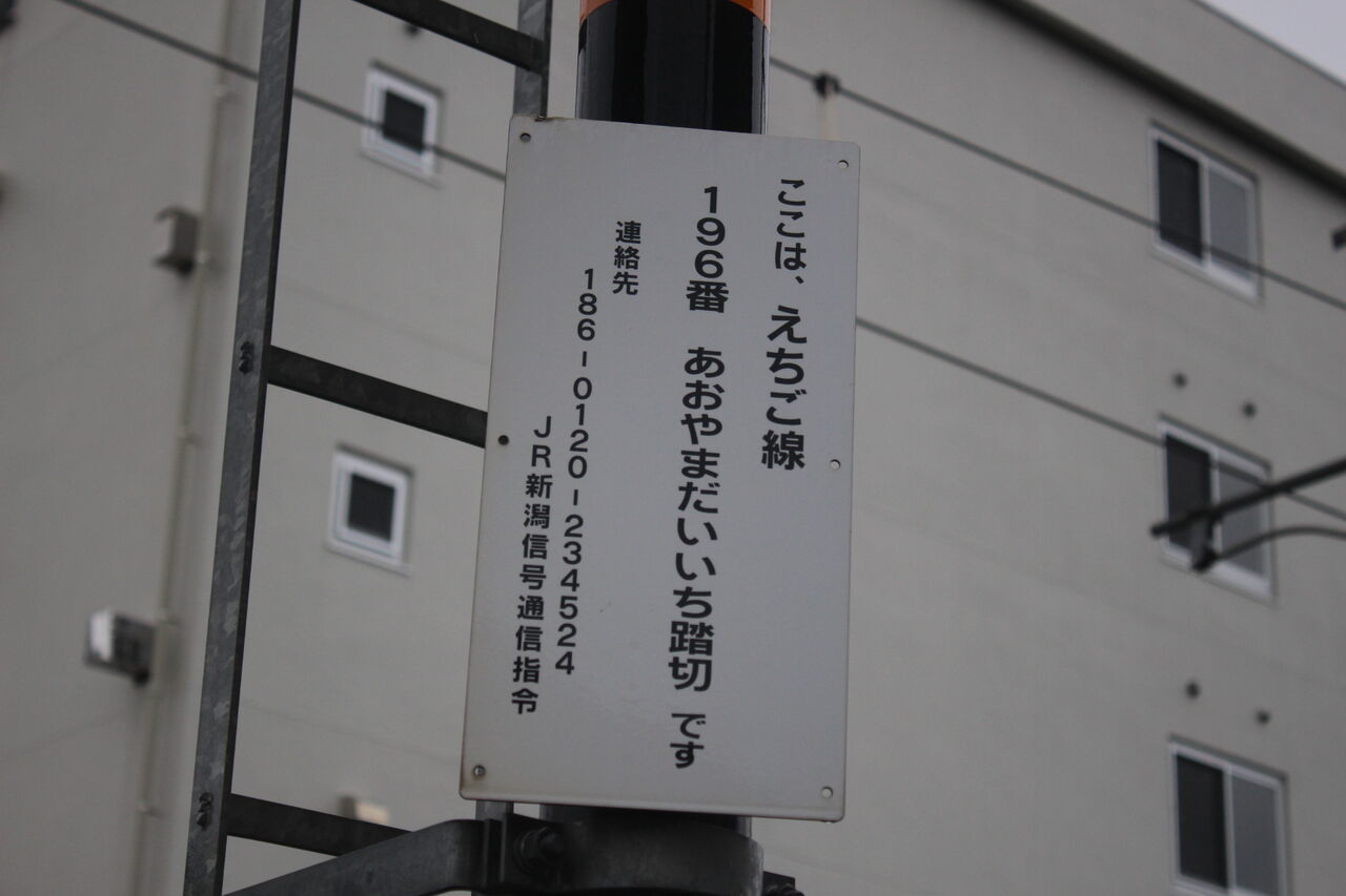 2024年03月04日 [JR越後線]青山第一踏切(77k785m) 〔踏切名称〕:青山第一踏切〔所在区間〕:JR越後線 青山・関屋間〔地点距離程〕:柏崎起点 77k785m〔管理事業者〕:東日本旅客鉄道〔踏切所在地〕:新潟県新潟市西区青山三丁目16番〔交差道路〕:新潟市道西3-48号線(023048)〔踏切所在地〕:第1種踏切(自動車通行可)続きを読む タグ :#越後線#第1種踏切#新潟県#第1・一踏切