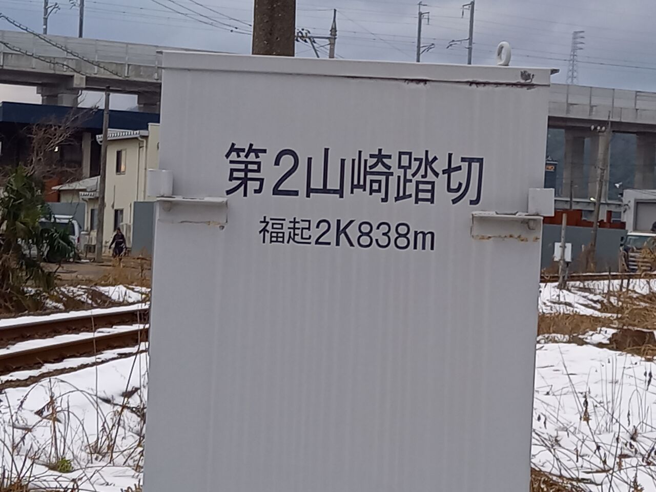 踏切のすぐ脇には列車乗務員向けの踏切看板があり、越前花堂駅からの踏切の数(1)が記されています。この看板は旧国鉄からJR西日本へ路線運営が移管された後にせっちされたもののようで、少なくともこの看板が出来た時点で既に山崎第1踏切はなく、当踏切が越前花堂駅から数えて一つ目であることを示しています。