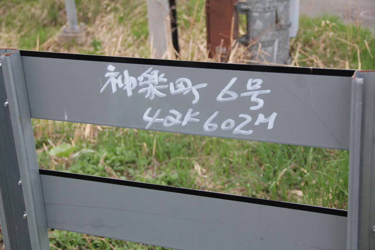 踏切名称は「神楽町6号踏切」といいます。当踏切も安全柵に手書きで名称と距離程が記されています。当踏切に限らず富良野線の踏切ではこのような表記が多数確認できます。当踏切のすぐ隣の交差点は前述の通り「西神楽2線6号」であり、その6号がそのまま踏切名称に採用されているのかなと。