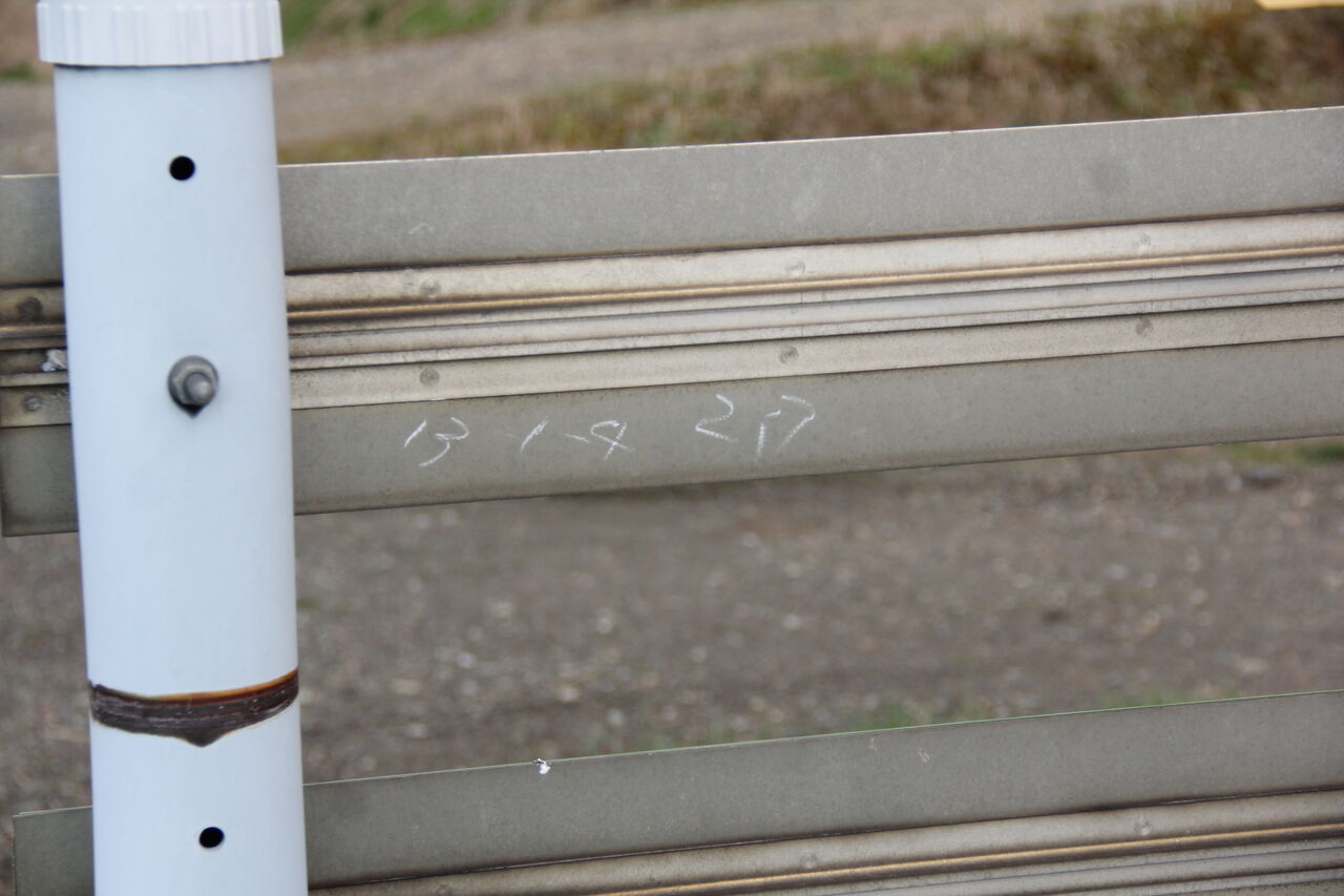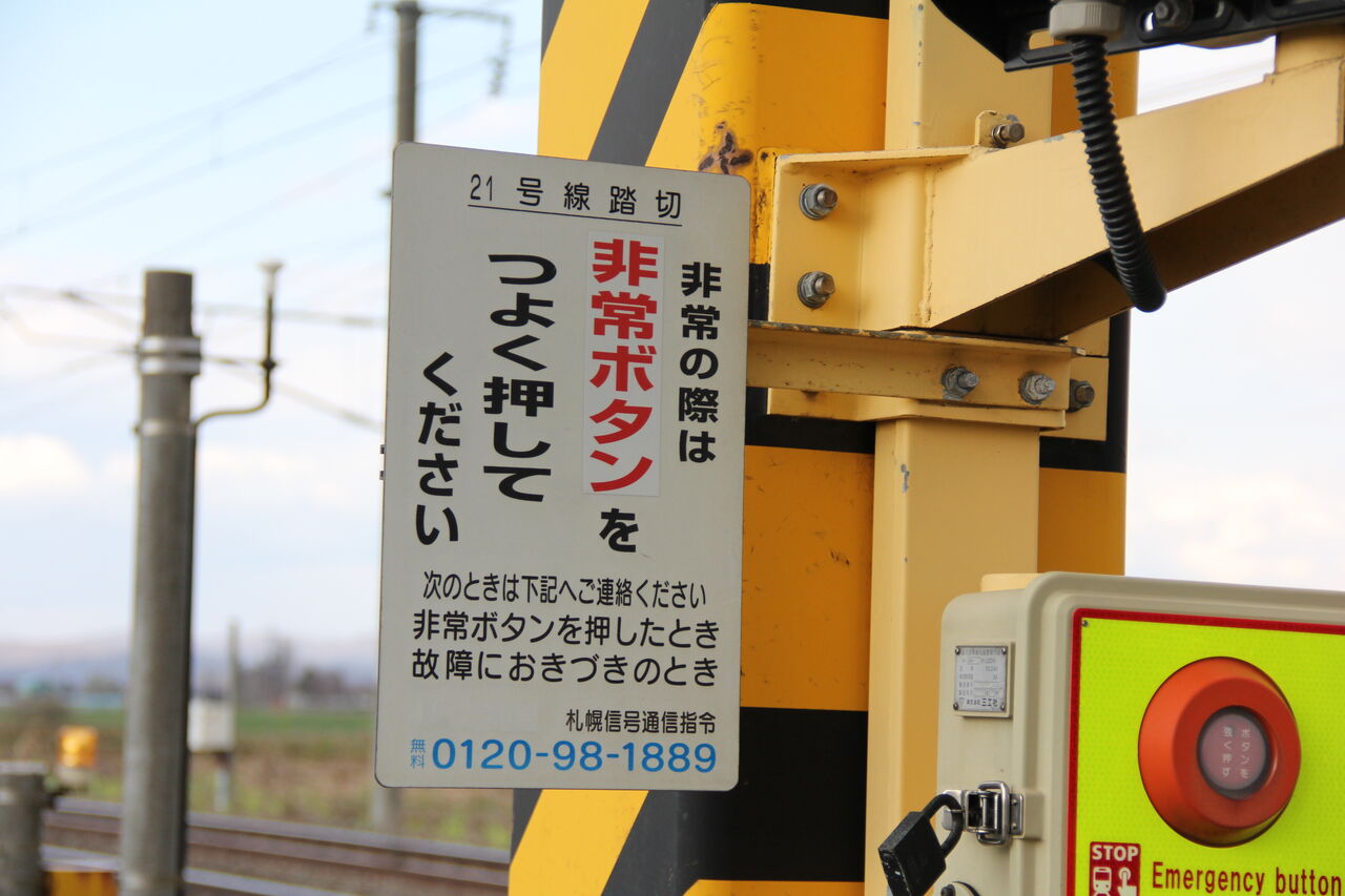 当踏切も電気関係(岩見沢電気所)のお仕事で、踏切銘板(黄色い看板)の代替としてステッカーを管内管理の踏切各所に掲出していて、これで踏切の名称と距離程が判読できます。当踏切は「21号線踏切」といい、距離程は函館桟橋起点で341k162mとのことです。この数字を見ると前述の手書き表記が341.162と書かれているように見えなくもない?!