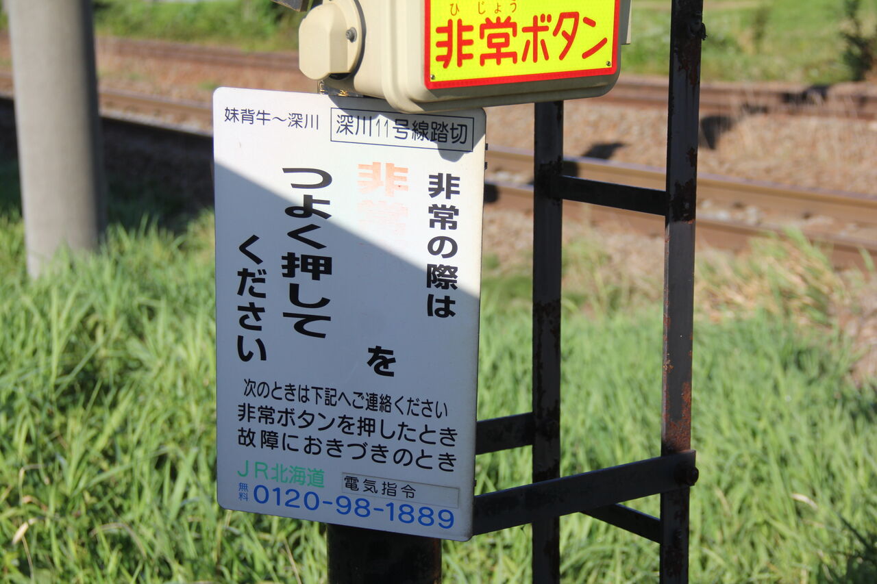 訪問(令和7年9月24日)時、数日後に迫る踏切工事の予告看板が掲出されていました。施工事業者さんは道内北見市に本社を構えておられますが、電話番号から推測するに旭川の支店が請け負っておられるようです。