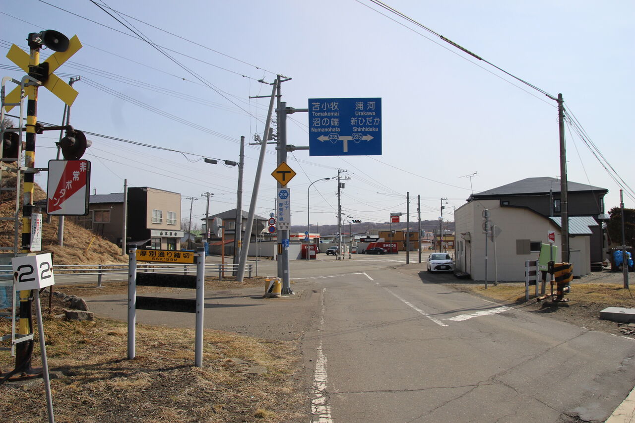 国道235号(浦河国道)から道道208号(比宇厚賀停車場線)に入ったところにある第1種踏切です。