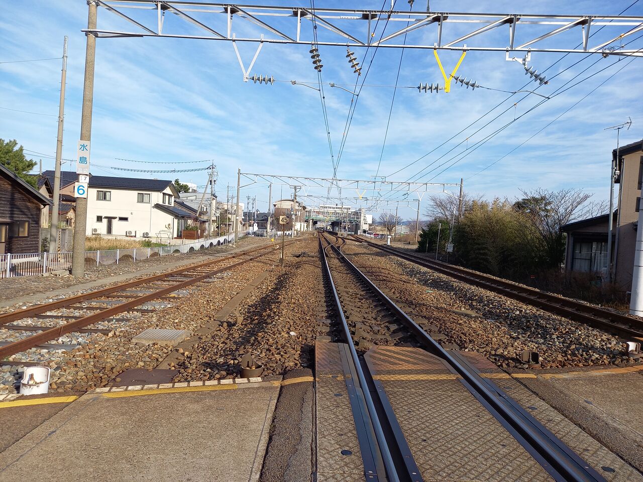踏切名称は「水島踏切」です。直接的な由来は調べがつきませんでしたが、当踏切が所在している白山市内には水島町という場所があり、そこから強引に採用されたのかなと邪推してみる。といってもその白山市水島町は当踏切からおよそ4キロ程度離れていて、もしそこが当踏切の由来だとしたら少々強引な。。。