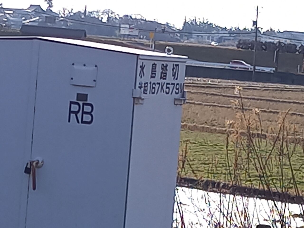 踏切端子盤収納箱には踏切名称と米原起点の距離程が記されています。