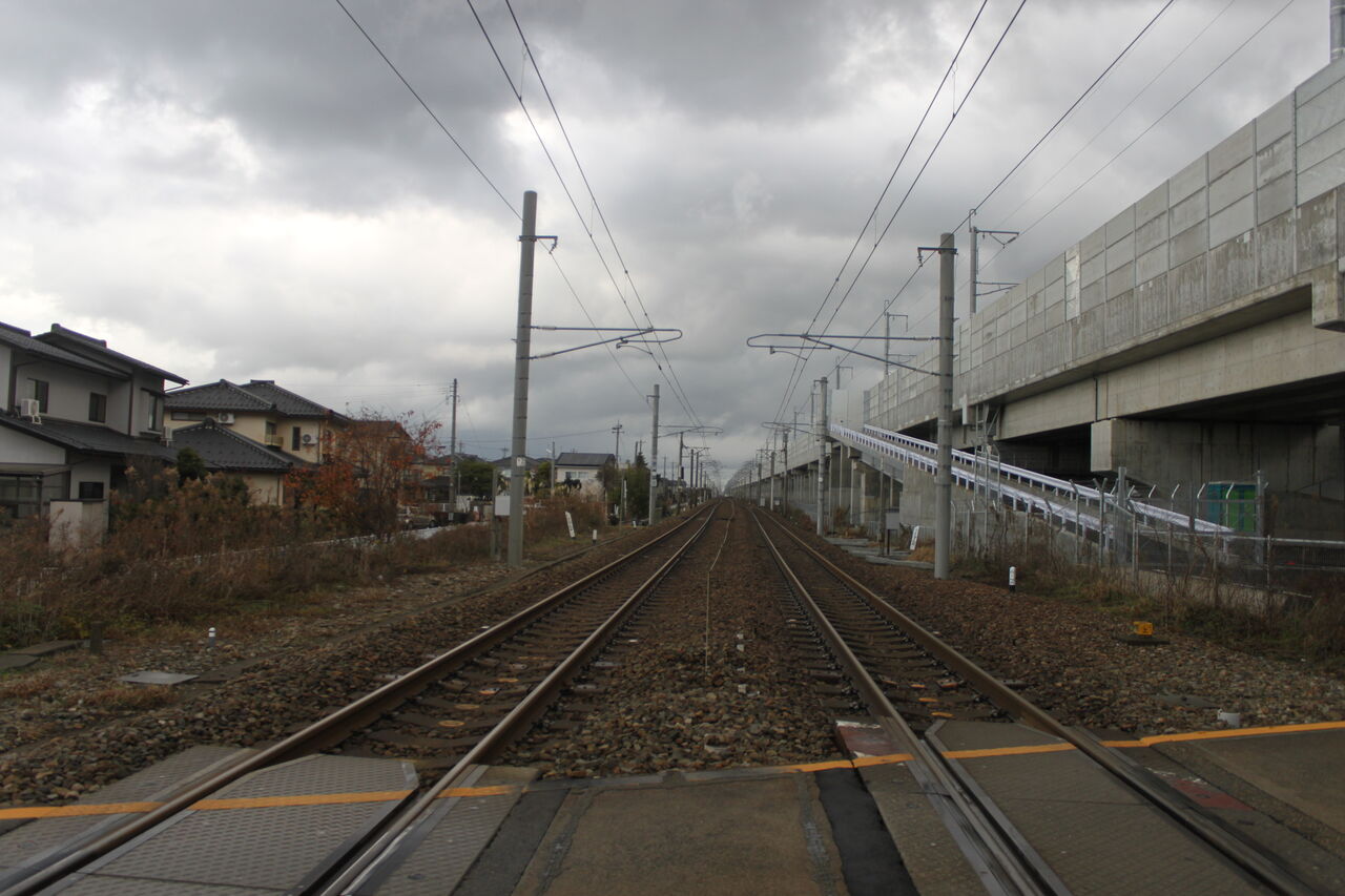 ↑こちらは加賀笠間・大聖寺・米原方、上り方向の線路です。この先すぐに加賀笠間駅構内に至ります。