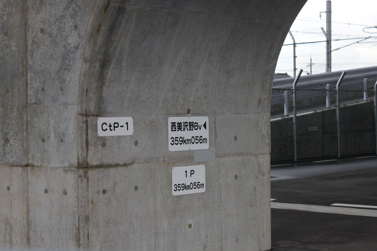 すぐ横の北陸新幹線橋脚には高崎起点の距離程(359k056m)が記されています。