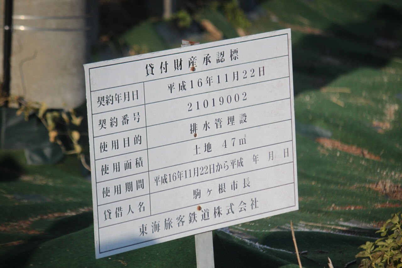 駒ヶ岳市による排水管埋設許可を出すJR東海の承認標です。
