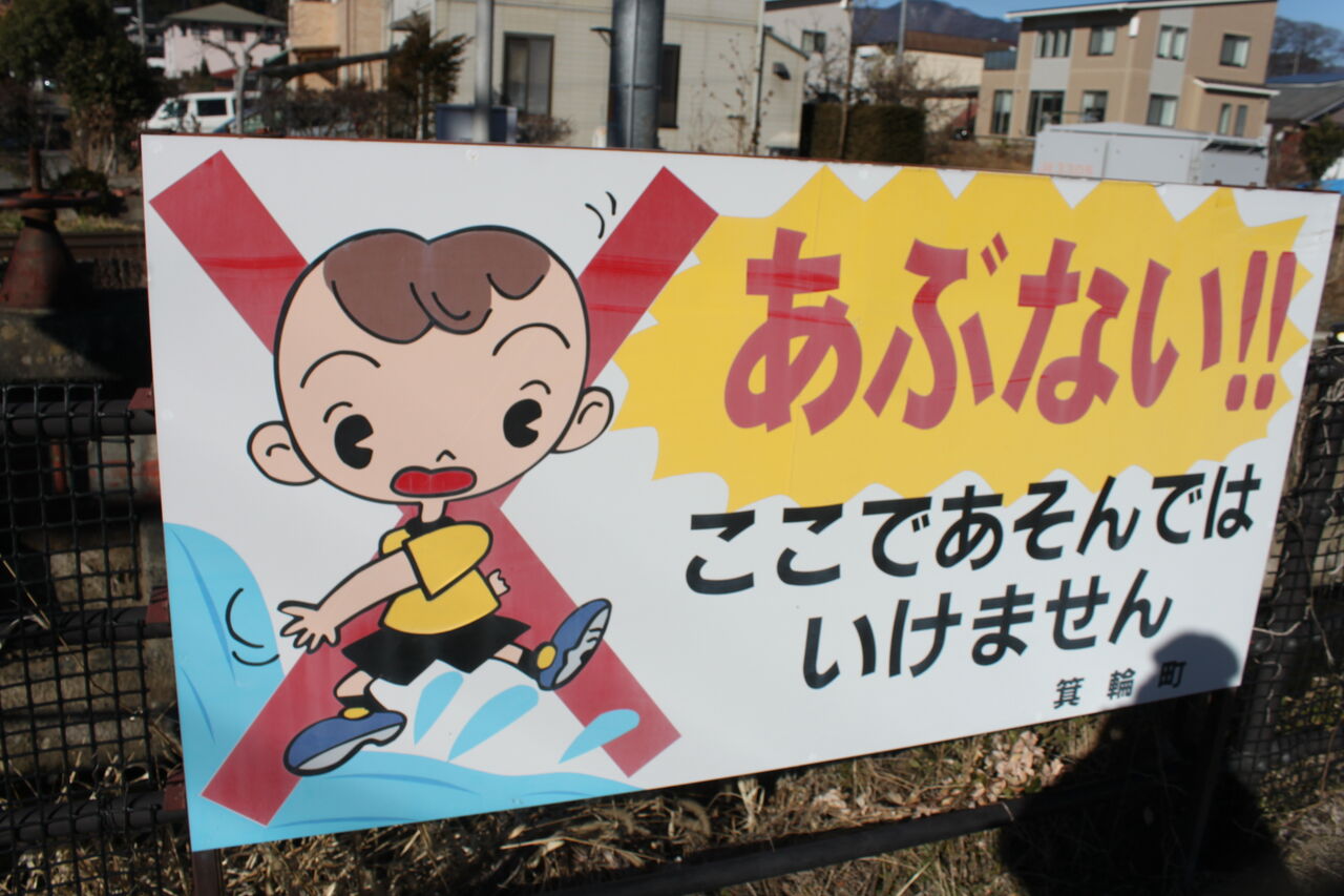 ↑当踏切前の用水路に掲示されている箕輪村謹製のあぶない看板です。