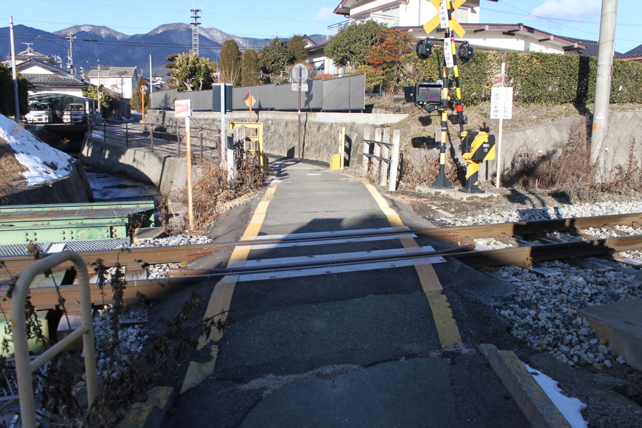 JR沢駅の辰野方にある小さな第1種踏切です。
