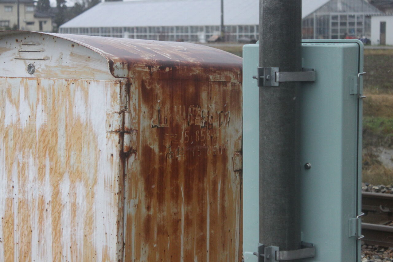 踏切端子盤収容箱には名称と高岡起点の距離程が薄っすら「高起 15k858m」と記されています。