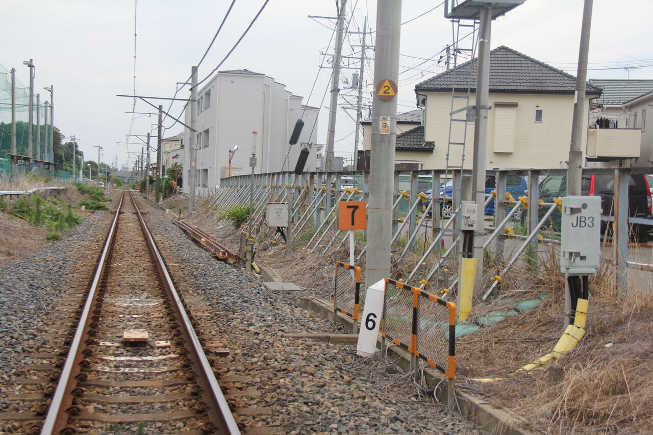 故障発見時の連絡と非常ボタン取り扱いを示す看板が掲出していますが、踏切通番は記載がありませんが、黄色い銘板にはNo.7の記載があります。指扇駅の脇にある上加道踏切はNo.1を名乗っており、そこから数えて7番目にある踏切ということなのでしょうけど、現存する踏切を上加道踏切から数えても当踏切は6つ目であり、この番号の附番以後に途中のどこかの踏切が除却されたのかなと。