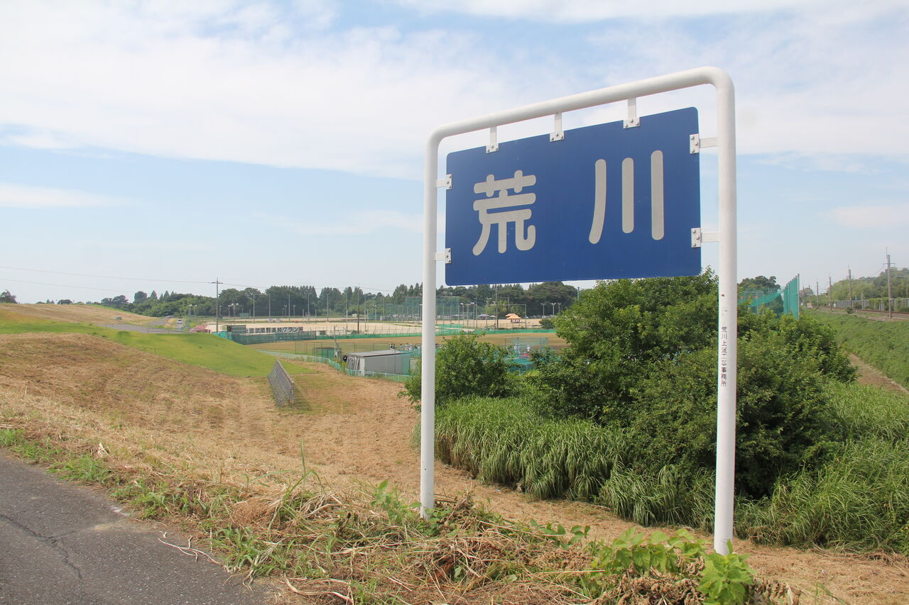 荒川の看板が出ていますが、この看板掲出の場所から河川敷が広大であることから荒川は遠く、その河川敷の土地は近隣の学校が借りているようで野球部のグラウンドが広がっています。