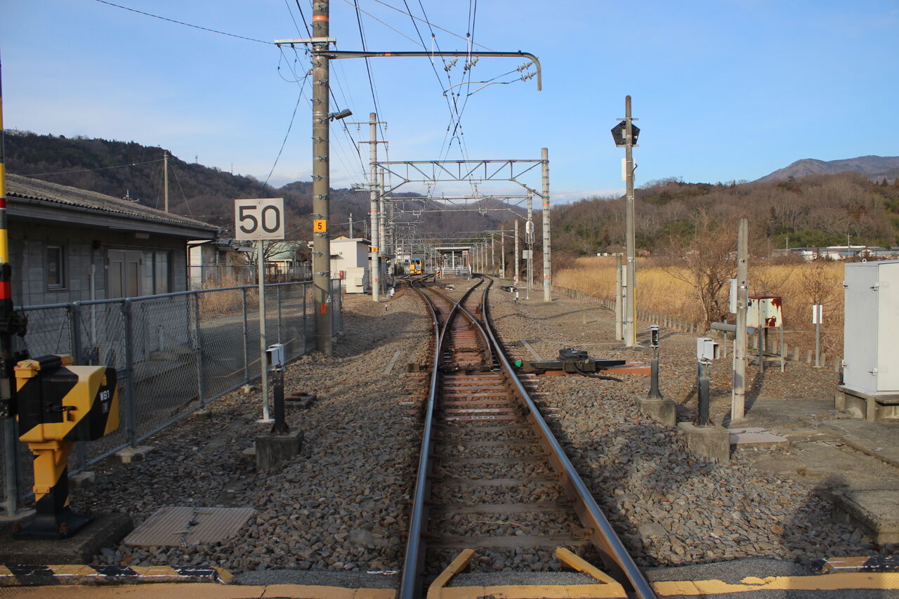 ↑甲斐岩間・甲府方、下り方向の線路です。この先すぐに甲斐岩間駅構内転轍機が迫ります。