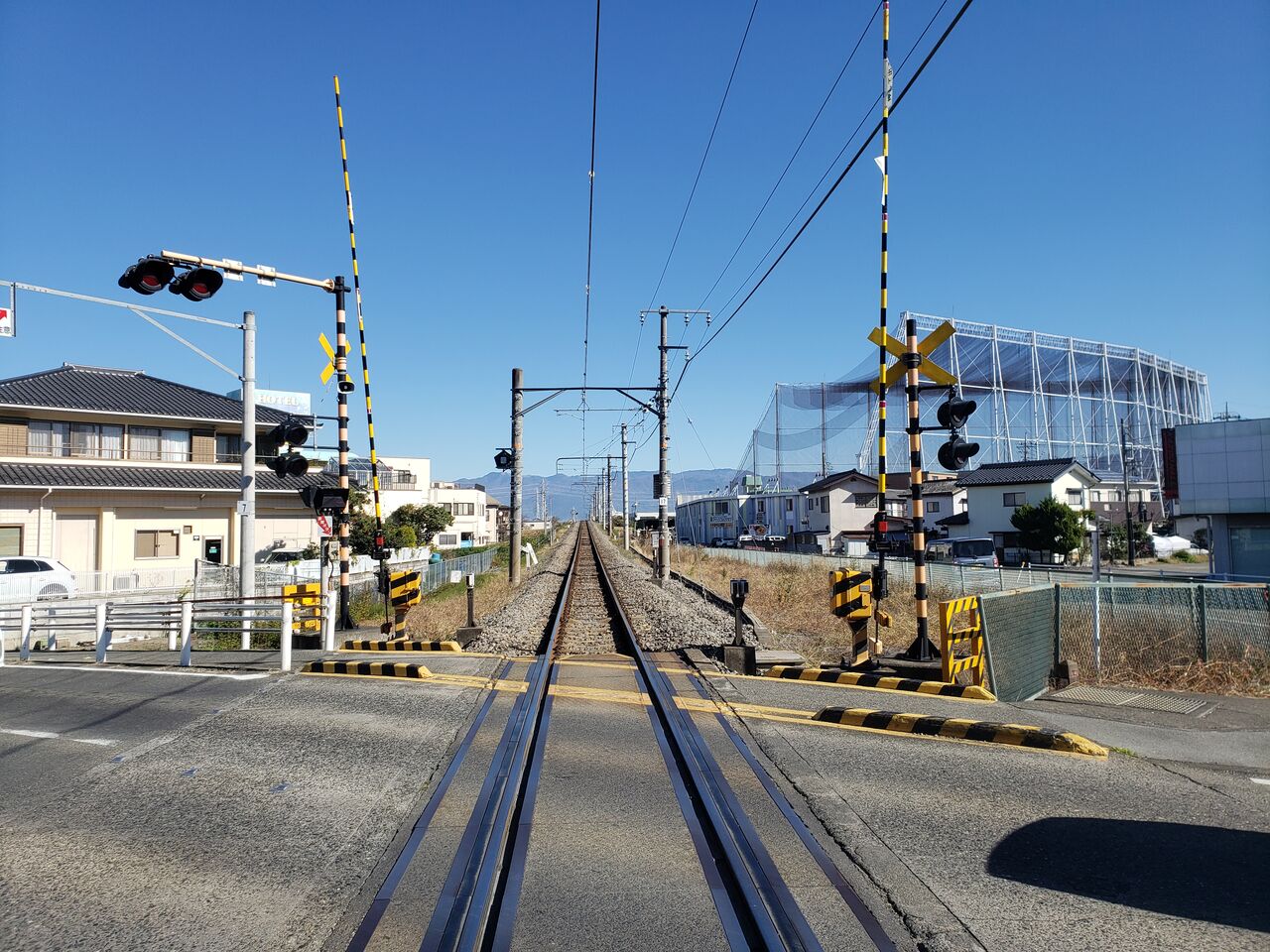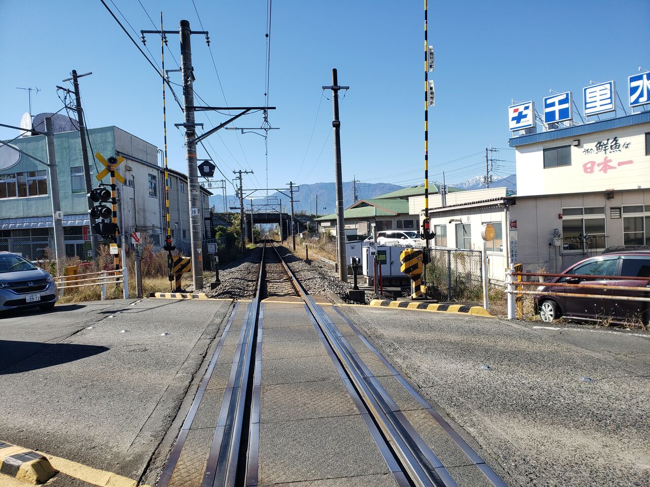 駅から適度に離れているため、すっかりクルマ生活エリアとなっていて、国道20号・甲府パイパスに近いこともあって↑の画像のように自動車が途切れたタイミングでの踏切撮影はかなり難しいです。