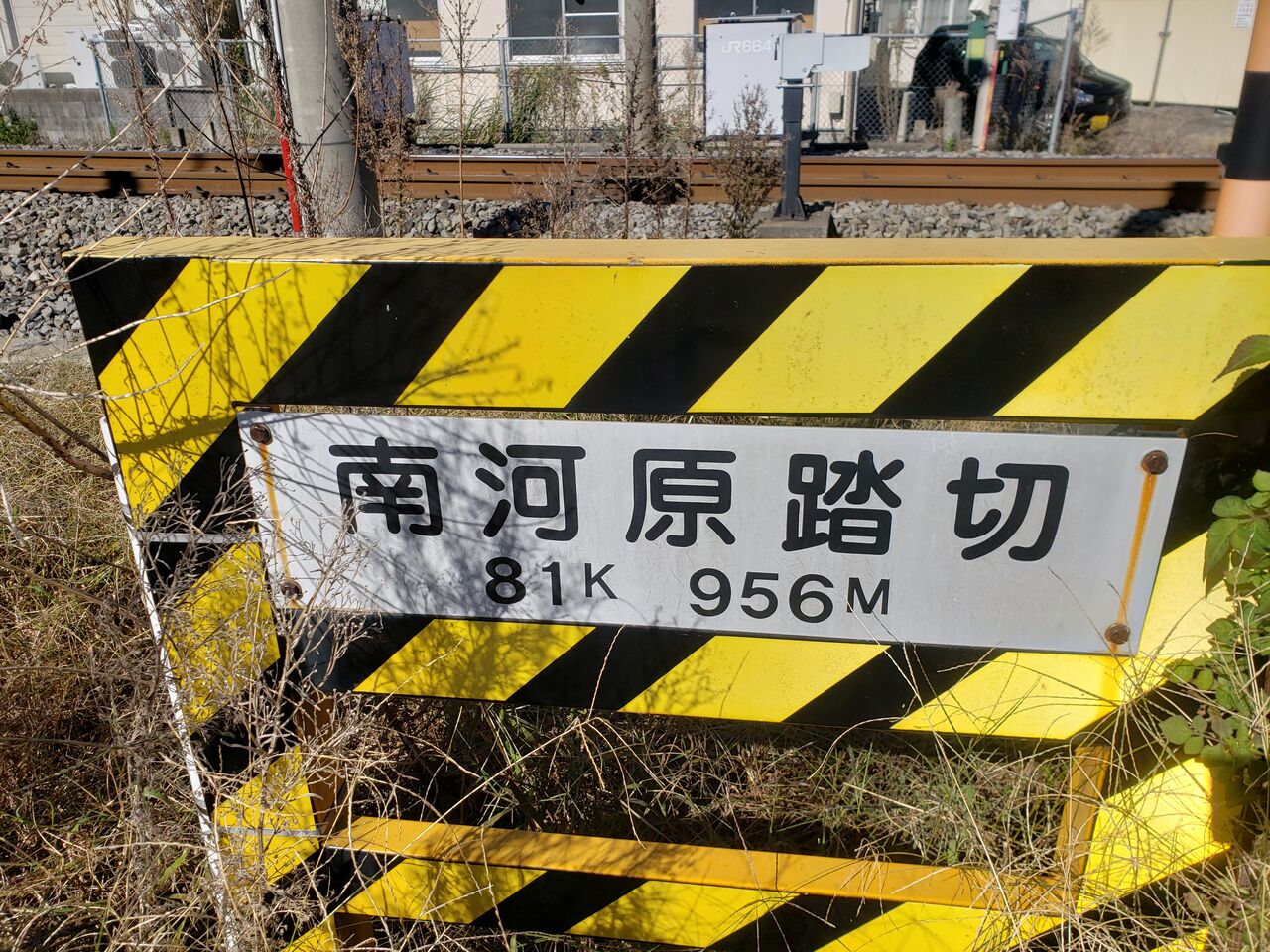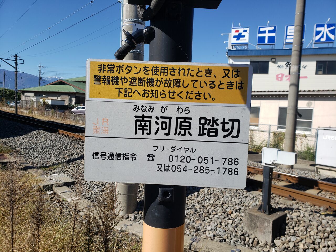 名称は「南河原踏切」といいます。由来はこの付近の小字名ですが、当踏切のすぐ近くには富士川水系の一級河川・荒川が流れていて、その荒川の南側に広がる土地ということもあるのかも知れません。