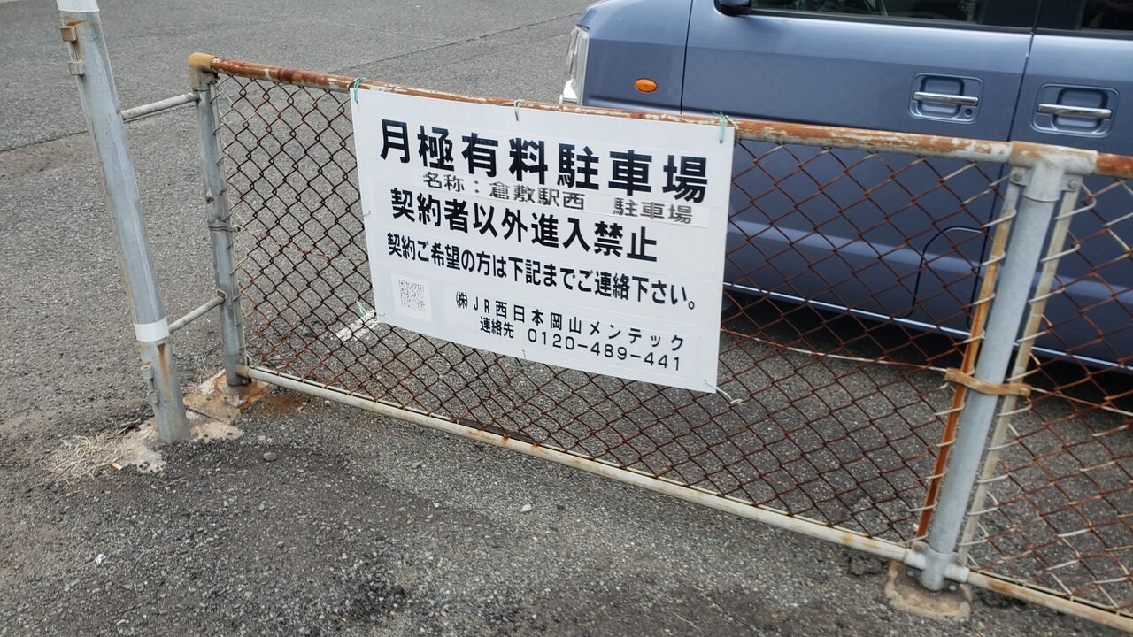 当踏切の下り方には倉敷駅西自転車駐車場があります。ここ、駐輪に掛かる料金は無料らしいです。画像の右側に写る踏切端子盤収納ボックスには踏切名称とキロ程が記されています。