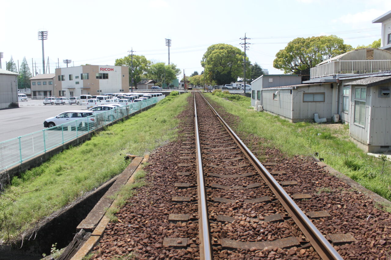 ↑球場前・三菱自工前方、下り方向の線路です。少し進んだ先に第1種踏切である四十瀬踏切があります。