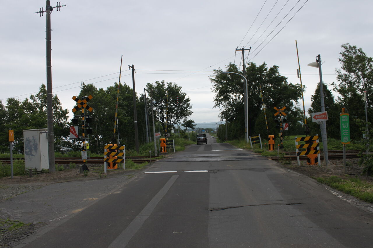 広大な農業耕作地が広がる中にある第1種踏切です。