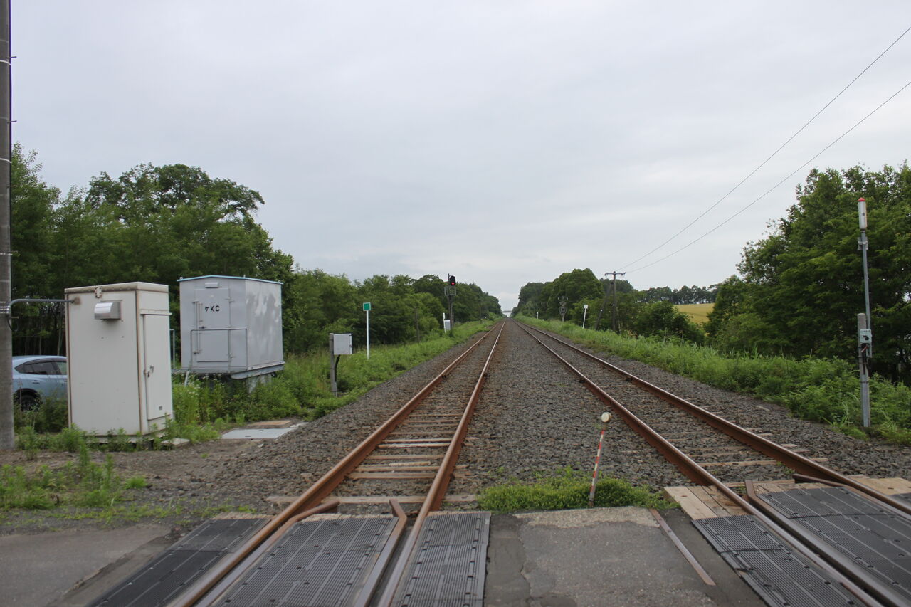 ↑こちらは追分・長万部方、上り方向の線路です。複線非電化の線路が一直線に伸びる様子は北海道らしさを実感します。