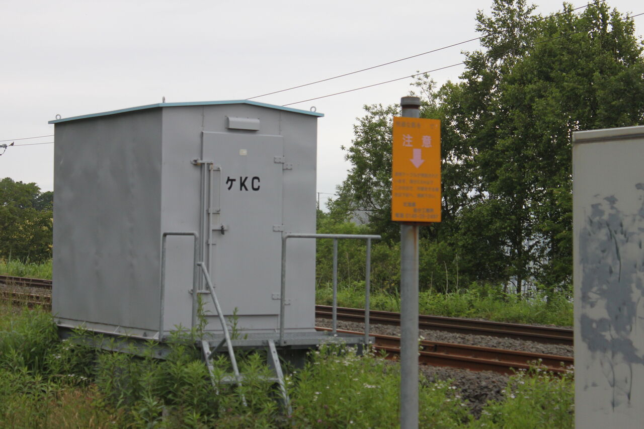 踏切端子盤収容箱の正面扉には踏切名称の頭文字から「ケKC」と記されています。名称は「新毛野地」なので「シKC」なのかなと予測していたので、、、となると「新」は後付けで、名称制定は「ケノチ」がポイントということ?!