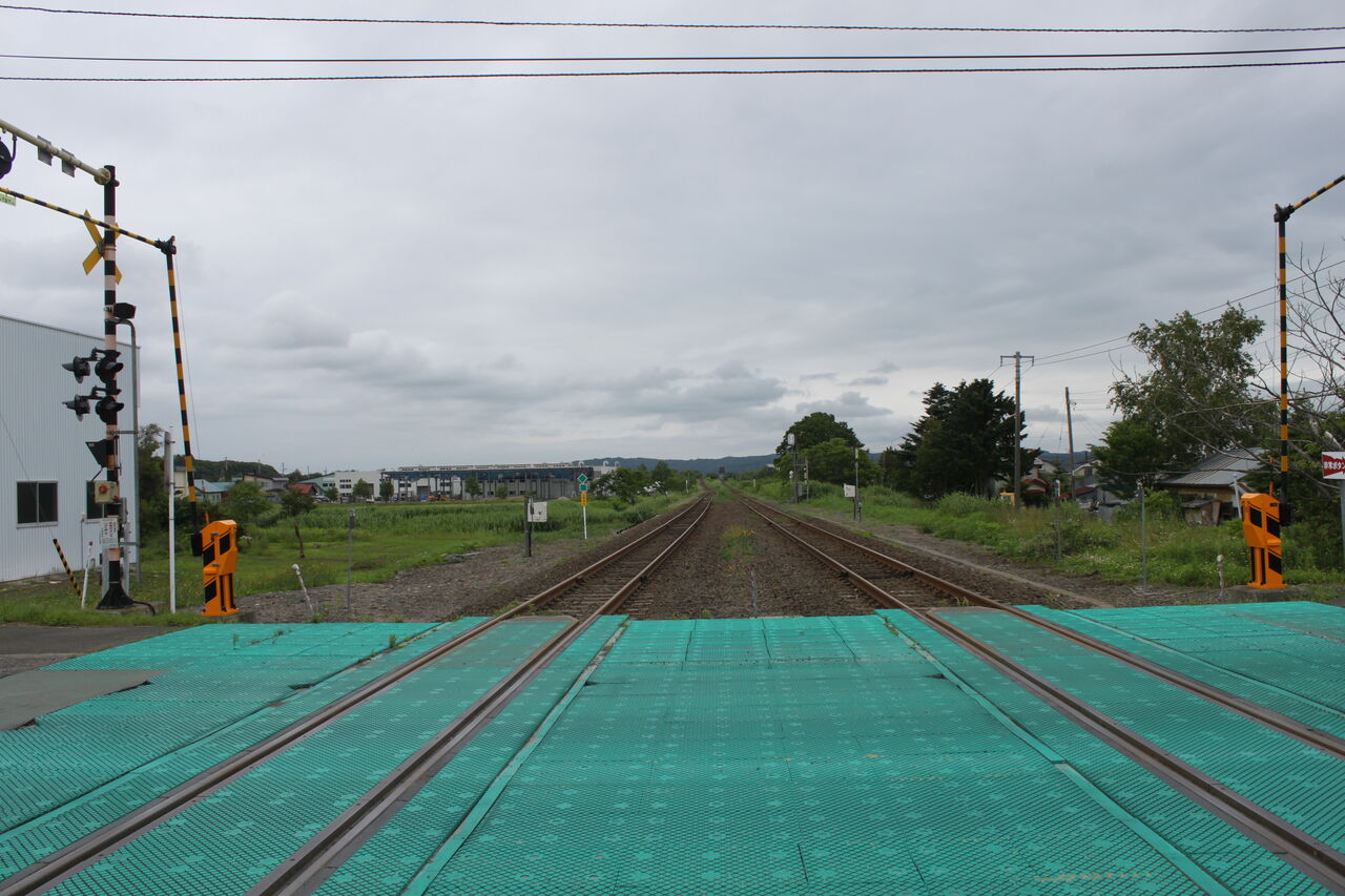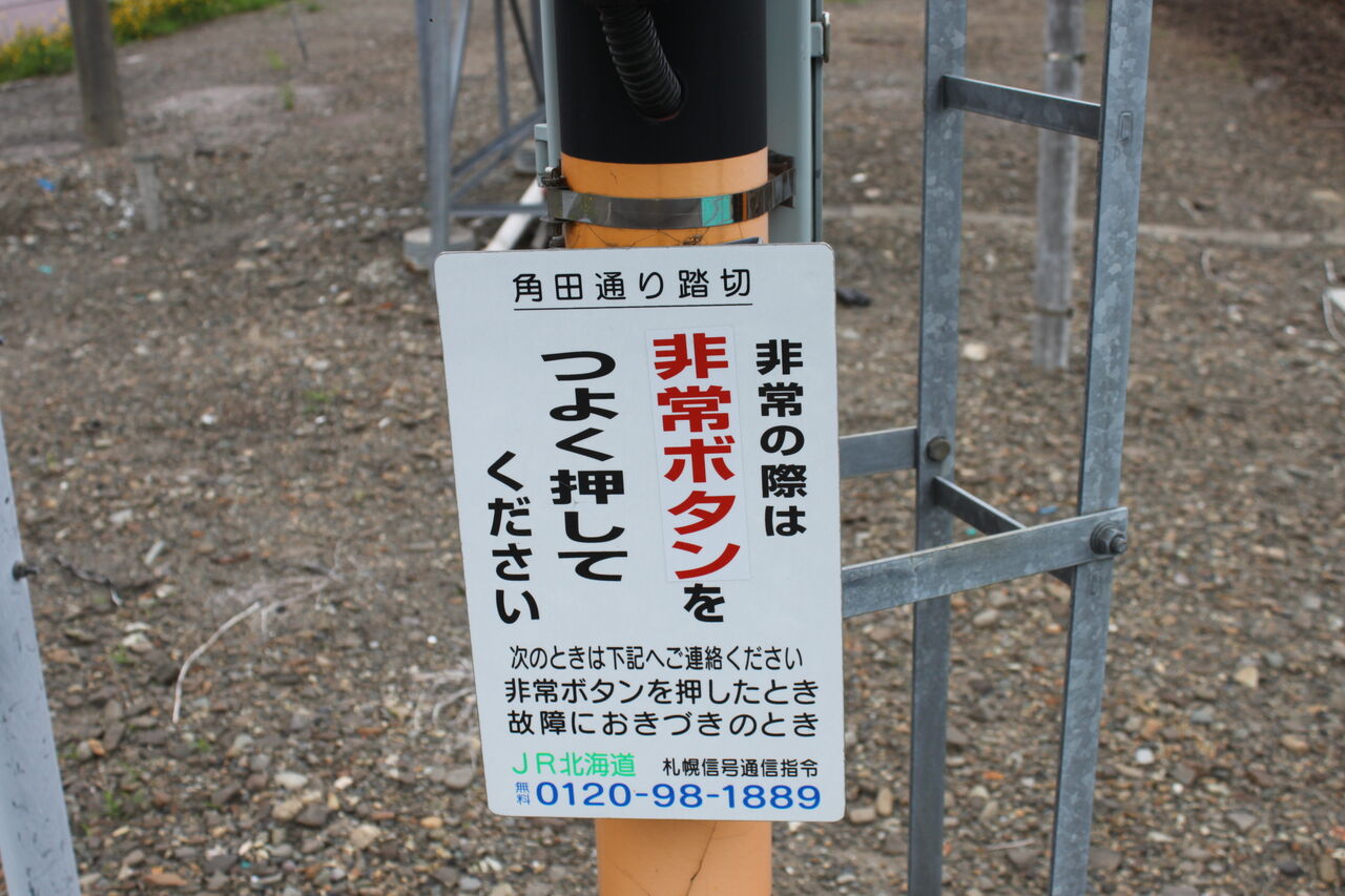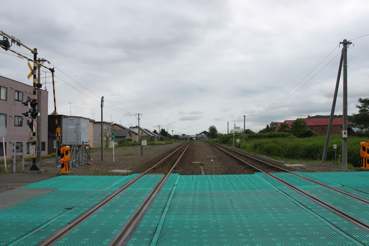 当踏切は「角田通り踏切」です。「角田」は栗山町の以前の呼称で、「かくた」と読ますのが正解なんだそうです。当踏切の現在の所在地は北海道夕張郡由仁町本町ですが、当踏切の名称にある「角田(かくた)」は近隣にある夕張郡栗山町の昭和24(1949)年の町制施行以前に名乗っていた村の呼称から採られているとみられます。角田へ至る道路が交差しているという趣旨なのでしょう。「角田」は仙台藩角田藩士(現在の宮城県角田(かくだ)市)により開拓されたことに由来しているそうです。