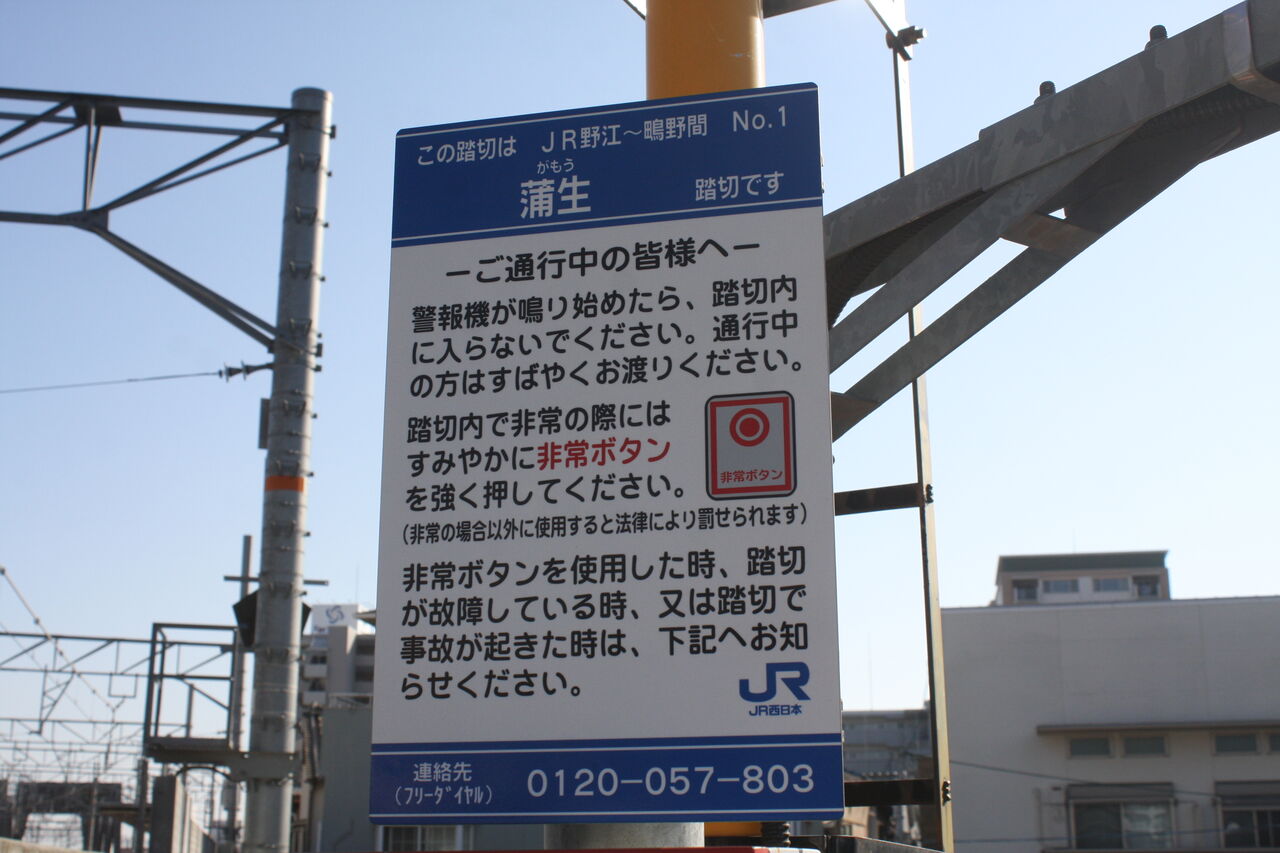 2024年01月04日 [JRおおさか東線]蒲生踏切(8k557m) 〔踏切名称〕:蒲生踏切〔所在区間〕:JRおおさか東線 JR野江・鴫野間〔地点距離程〕:新大阪起点 8k557m〔管理事業者〕:西日本旅客鉄道〔踏切所在地〕:大阪府大阪市城東区蒲生二丁目4番〔交差道路〕:大阪市道城東区第1761号線〔踏切種別〕:第1種踏切(自動車通行可)続きを読む タグ :#おおさか東線#第1種踏切#大阪府