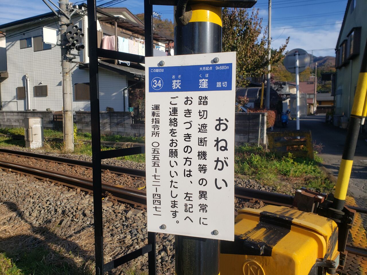 名称は「荻窪踏切」といいます。大月駅から起算して34番目の踏切であることが記されています。このシールは大きな看板のそれと同じ様式ですな。「荻窪」の由来は不明ですが、近隣に「荻窪」といううどん屋さんがあり、由来の一助となっているとみられます。