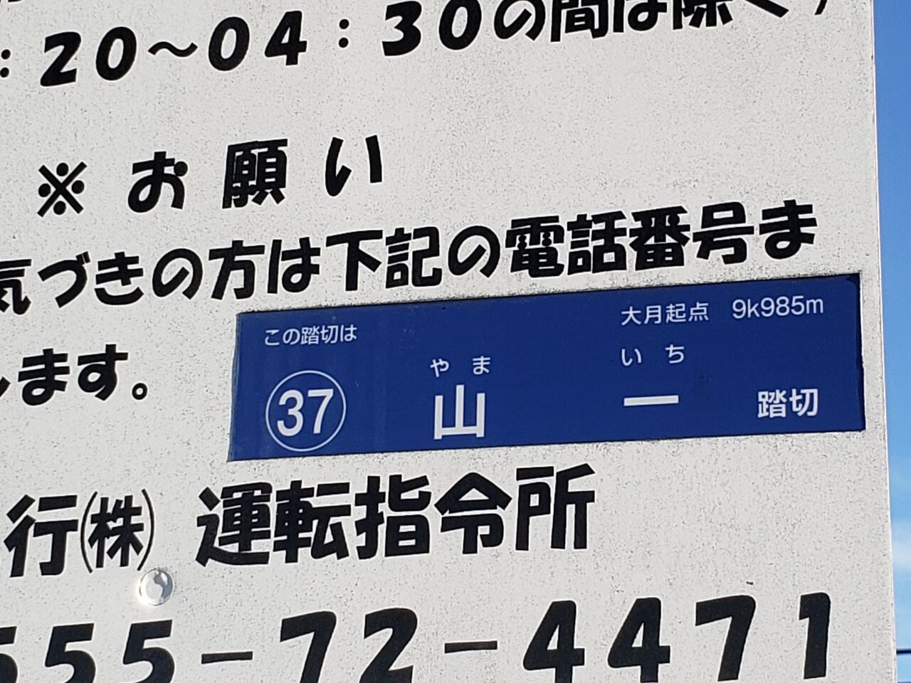 名称は「山一踏切」といいます。大月駅から起算して37番目の踏切であることが記されています。当踏切から程近い場所にある「山一岡部工場」が由来となっているとみられます。