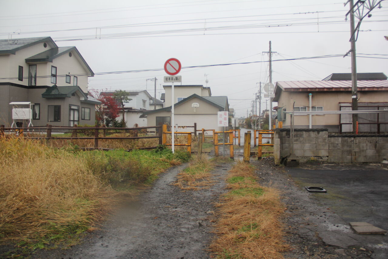 当踏切の名称は「千年北部踏切」です。弘南鉄道千年駅の北側に設けられたので「北部」を付与して名称にしています。この交差道路は弘前市的には市道の名称が制定されていないようですが、建築基準法第42条第1項第3号道路として認定は実施されています。単に名称付与を失念しただけ?!