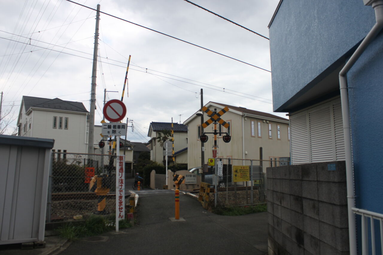 踏切名称は「南河内第一踏切」。看板には所在地が記されていますが、この看板が設置された当時の「茅ケ崎市香川字南368-8」とあります。現在は「茅ヶ崎市香川四丁目28番27号」となっています。
