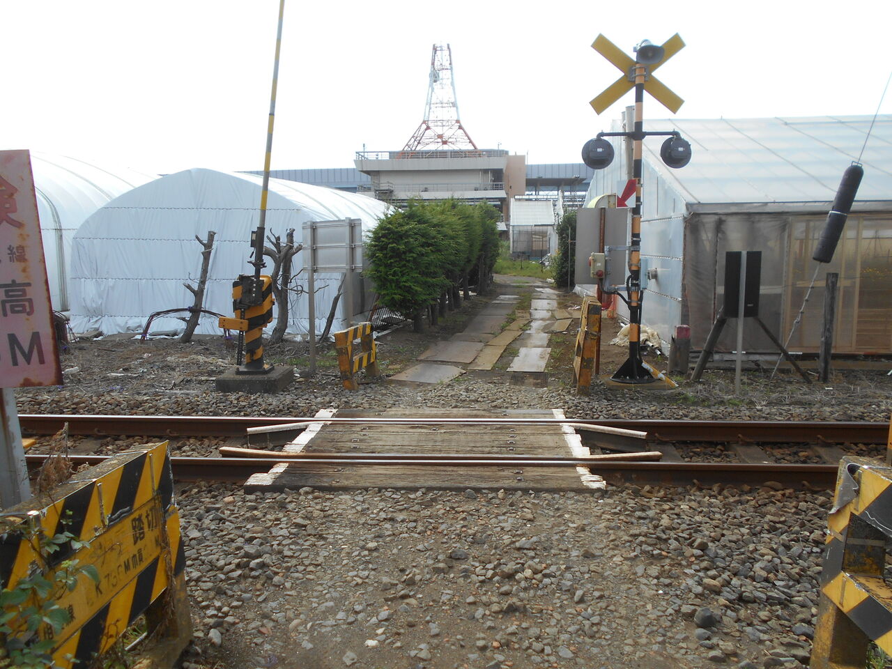 線路前後の道路は公道では考えにくいバラスト路盤。。。北海道の踏切を思い起こさせます。