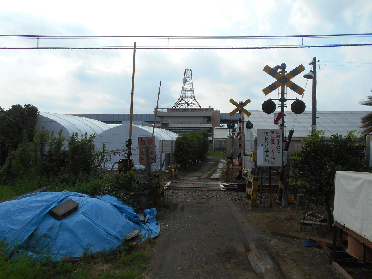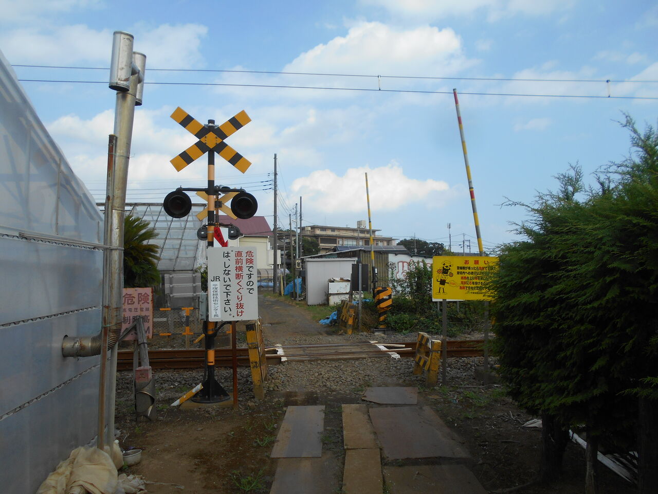 私有地?っぽい風情の場所に忽然と立派な第1種踏切が設けられている様子はシュールそのものです。道幅狭い印象で一見すると自動車の通行が規制されているのかなと見えますが、公道ではないようなので交通標識はありません。JR相模線電化化前までは第4種踏切だったのかなと。。。