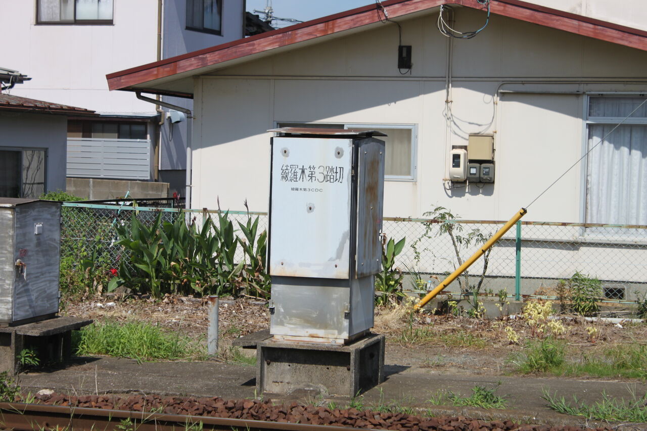 踏切端子盤収納箱には踏切名称と距離程が記されています。