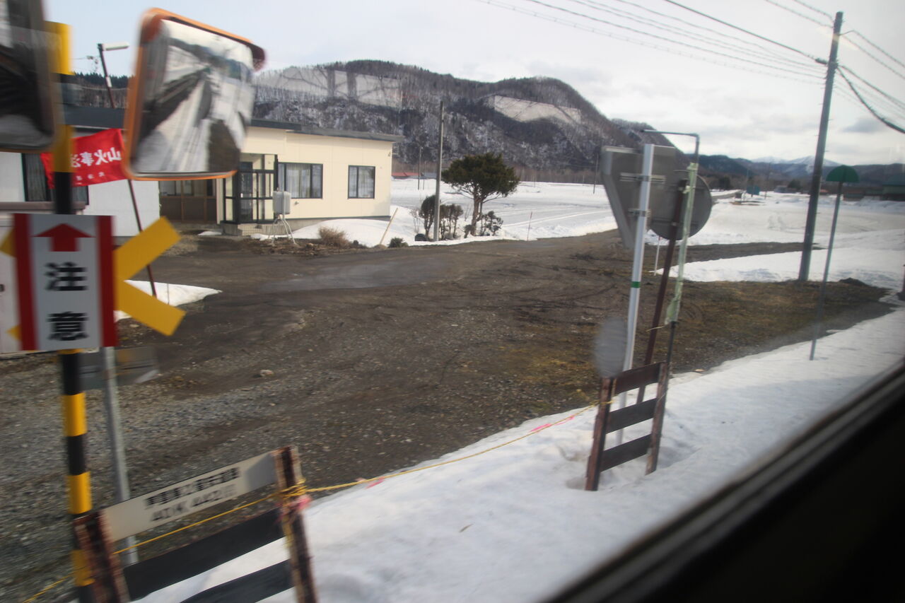 冬季だからなのか、線路わきの踏切前は除雪されておらず、また踏切柵にはトラ柄ロープで仕切られているように見えました。