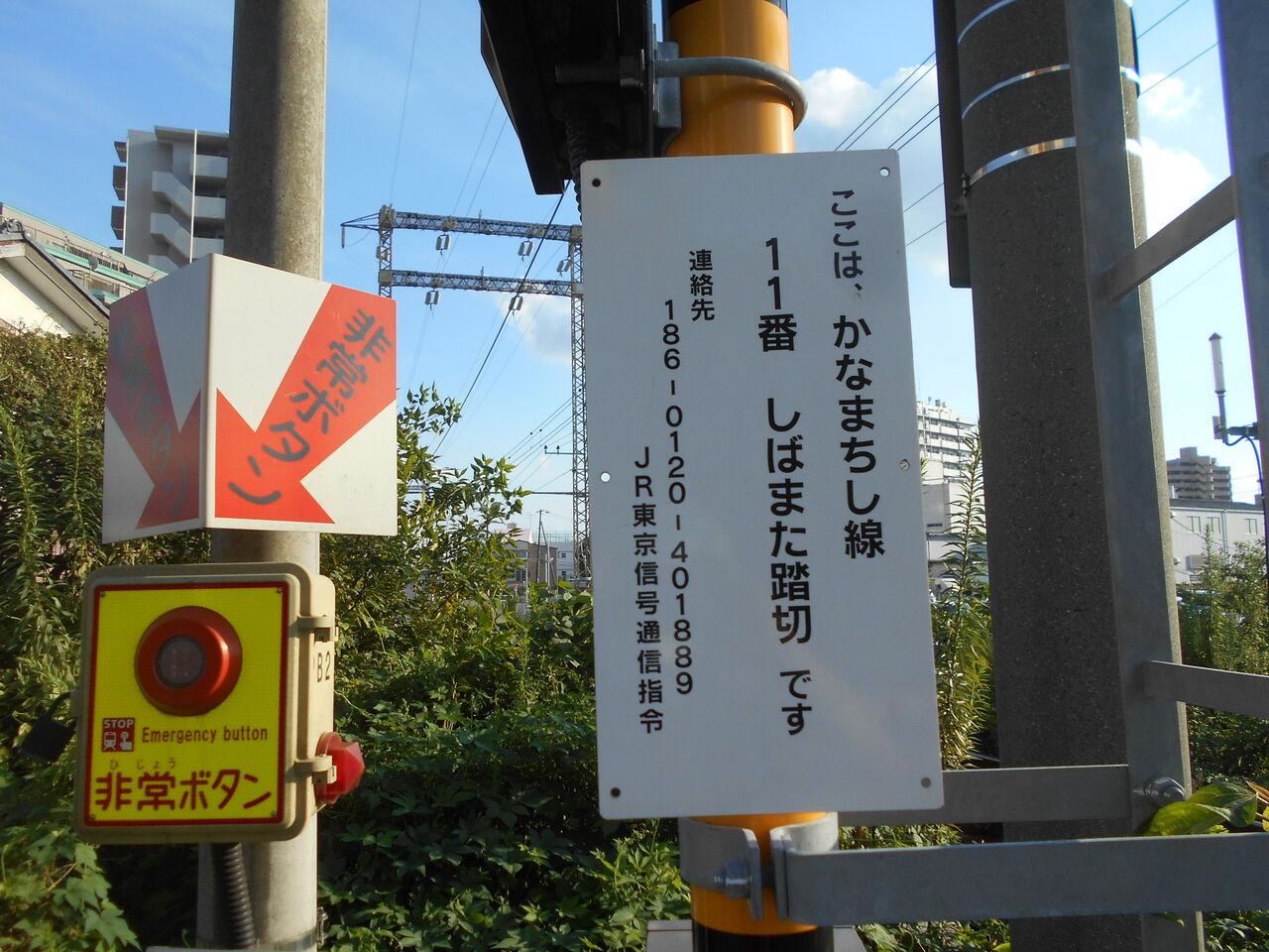 非常ボタン取扱注意札看板には「しばまた」とフリガナが示されています。起点から11番目の踏切であることも記されています。