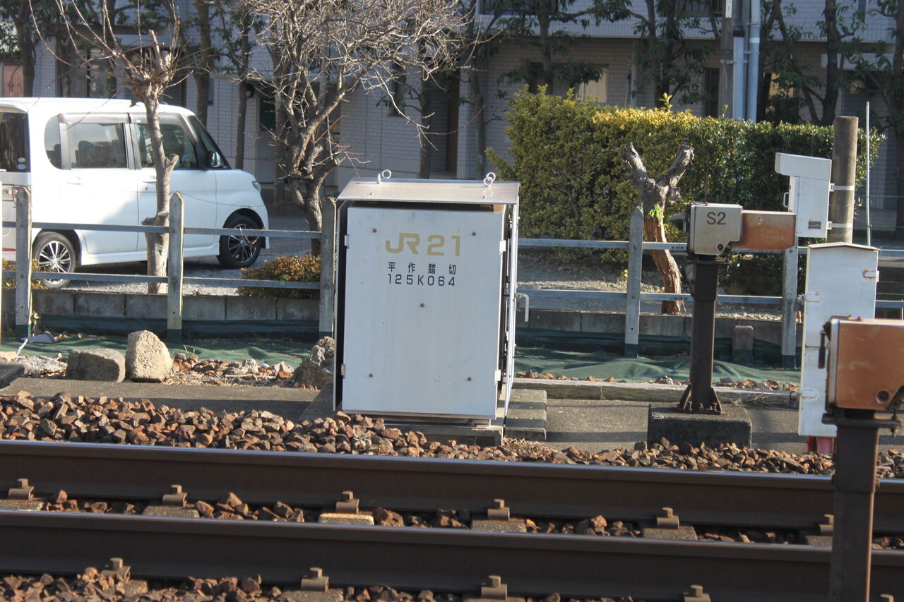踏切端子盤収納箱にはJR東海の踏切通番(21)と名称・距離程が記されています。