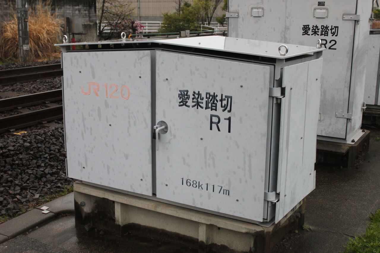 当踏切の脇には踏切端子盤収納箱があり、JR東海の踏切通算番号(120)が表示されています。
