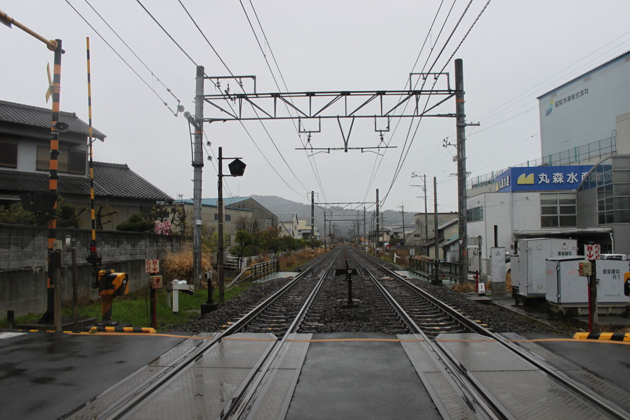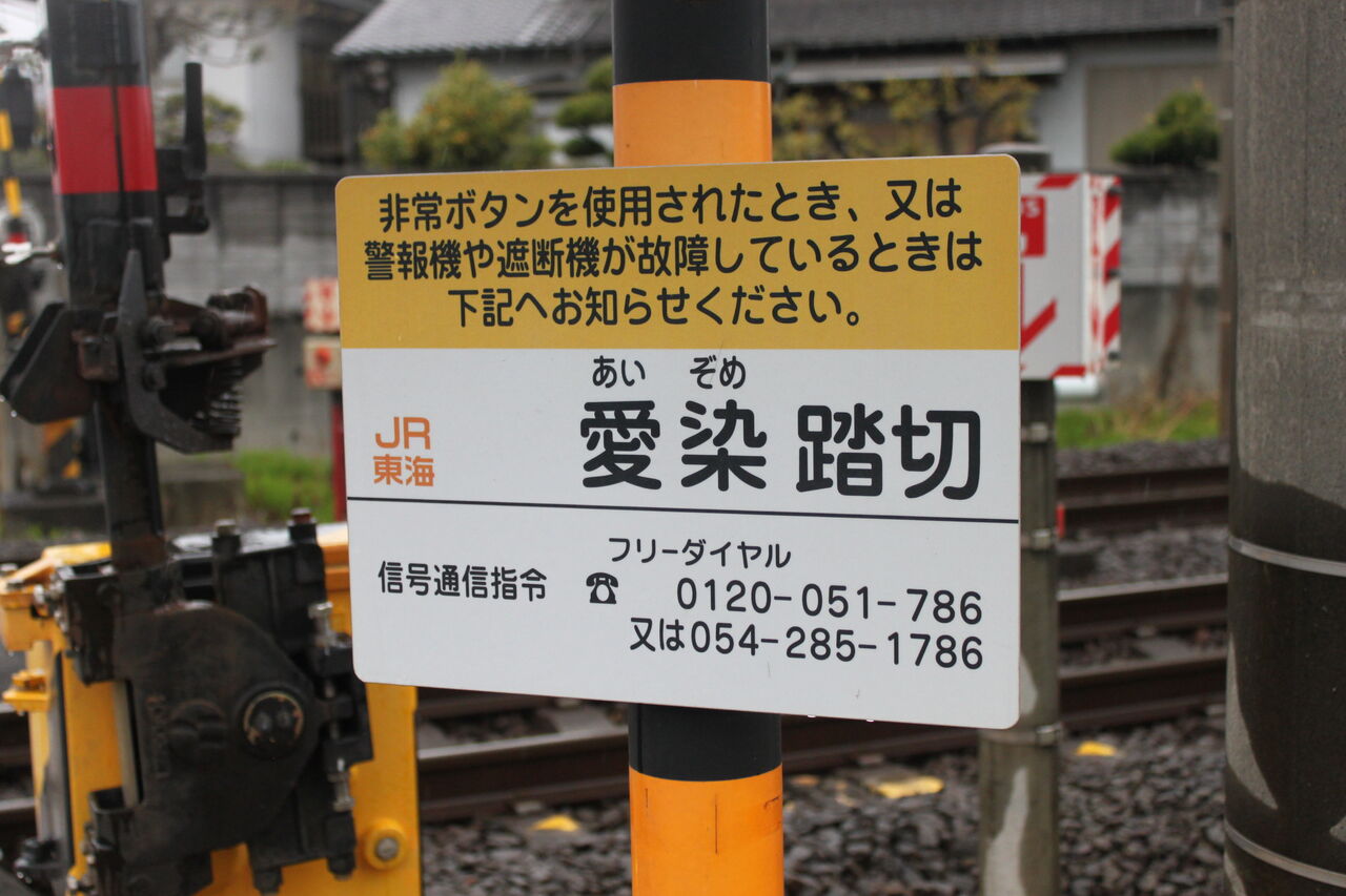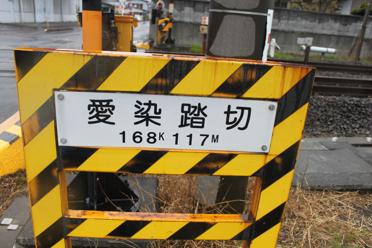 当踏切の名称は「愛染踏切」です。当踏切の所在地がそのまま名称に採用されています。愛染は近隣の河川が藍で染めたように美しい色だった川が由来なんだそうです。