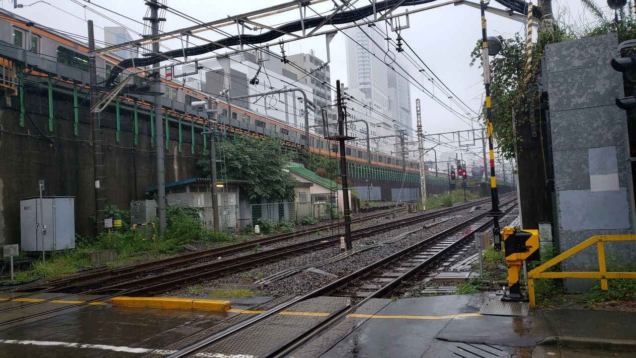 ↑新宿・田端方面、下り方の線路の様子です。踏切を抜けると実質的な新宿駅構内となっていて、中央線の線路が交差します。
