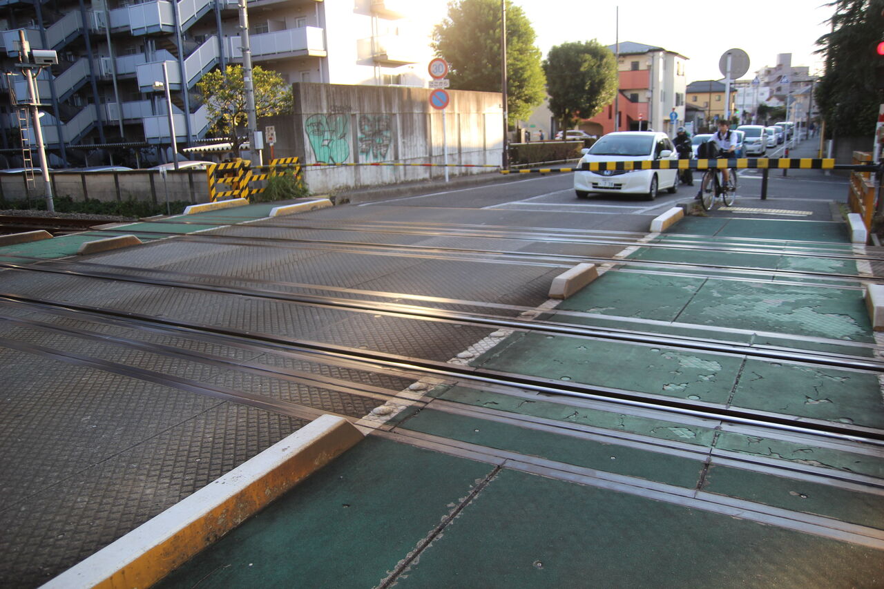 当踏切は歩道と車道の区画が分けられて、歩行者は比較的安全に踏切の横断ができます。